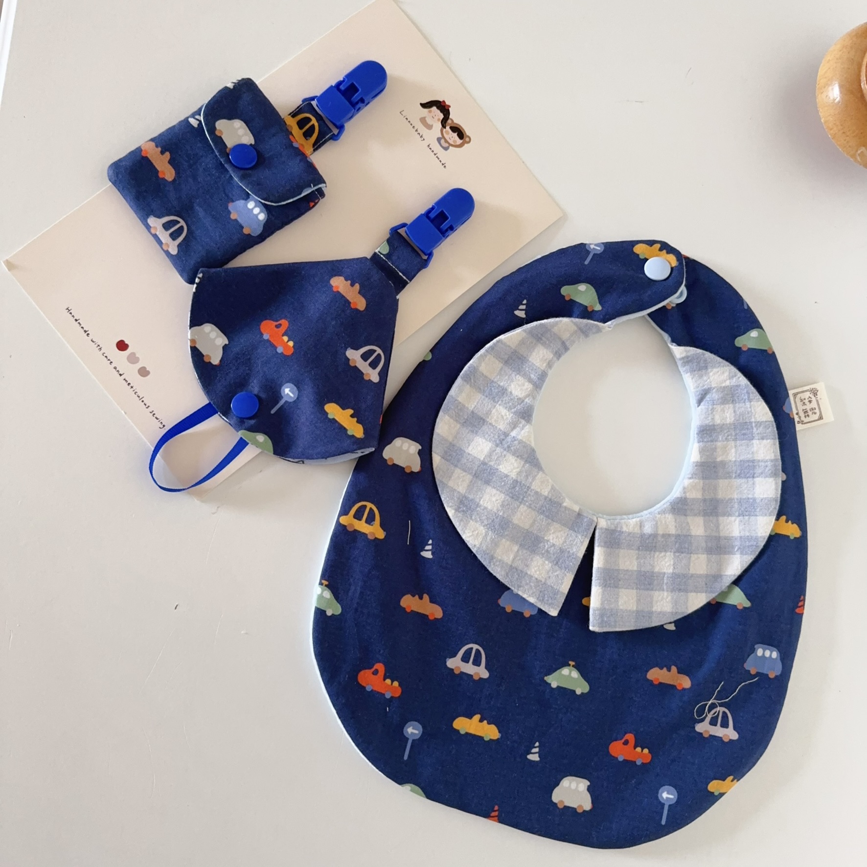 (可單買) 深藍汽車 雙面領兜 手工奶嘴鍊+防塵套 平安符袋